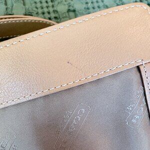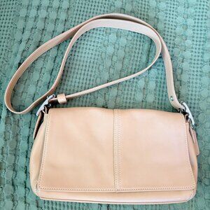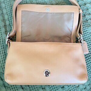 Beautiful Vintage Coach Demi in Camel with original hangtag. Made in 2004. Only callout is a very small and light pen mark on the inside flap. Please look at pictures as they are part of the description. Can be worn as a crossbody or doubled up strap (as shown) for a cute shoulder bag.