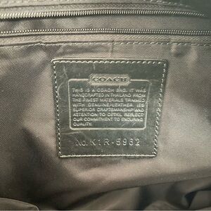 Everyone knows the older Coach stuff is superior!! Coach duffel bag in heavy nylon for water resistance with leather trim. Too handles with a detachable strap for shoulder. Interior zippered pocket as well as large regular pocket. Corner leather patches show very slight wear, otherwise like new. Approx. 24x12x11.5”