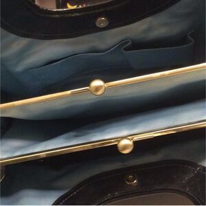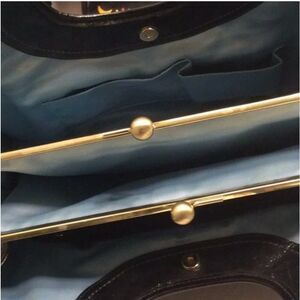 Coach 12520 Ergo Pleated Framed Patent Leather Satchel. Details: Glossy black patent leather exterior with pleats. Coach patent leather is very durable, great for year round and all weather conditions, and very easy to clean. Silky blue interior , Brass hardware and kiss lock closure. Perfectly round double shoulder straps with 9 inch drop. Three interior compartments: center compartment has kiss lock closure, zipper pocket on inside of one side pocket, phone pocket and wallet pocket on opposite side. Measurements: L x W x H - 15” x 4” x 8”. This bag is in excellentcondition .