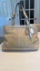 Chic Coach tote in beige suede. Features sturdy handles and signature tag. Ideal for daily use.