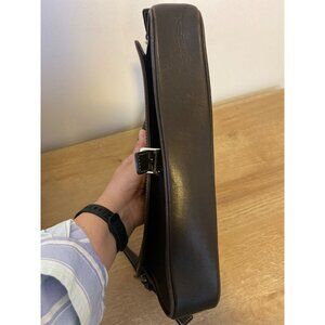 A sophisticated Coach leather shoulder bag featuring a sleek brown finish, buckle detail, and adjustable strap. Compact and functional for everyday essentials.