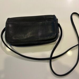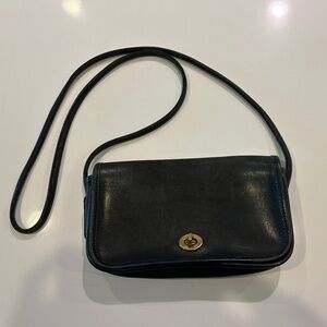 Vintage black leather coach leatherware shoulder bag / purse. Has a top flap with a clasp for closing, shoulder strap that can be used as a shoulder or cross body strap, and interior pocket with zipper and Coach logo. Amazing condition, just regular wear from time, no flaws.