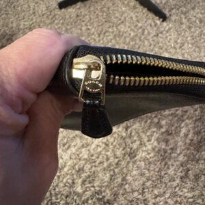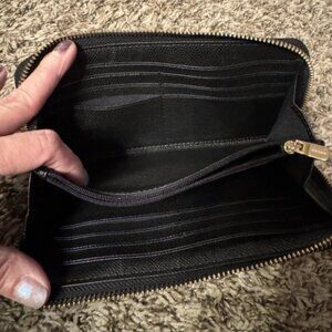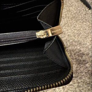 This Coach Black Leather Wallet is a classic and stylish accessory for women. Made from high-quality Coach leather, this wallet features a solid black color with the iconic Coach logo as accents. The zip-around style and credit card slots offer functionality and convenience. Perfect for everyday use, this wallet exudes timeless elegance and sophistication, making it a versatile piece for any wardrobe.