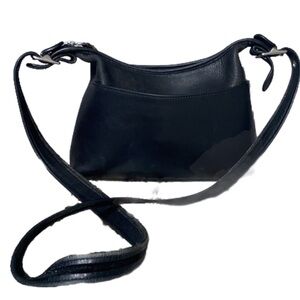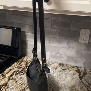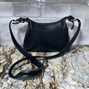 Vintage Coach Legacy shoulder bag (#9136) in black leather with brass accents. Previously owned, in very nice condition. Adjustable 1” strap, full pocket along the front. Great size. Includes Coach hangtag.