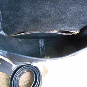 One main compartment with unlined interior, Exterior back pocket, and Interior zipper pocket. The bag has brass hardware with its original Hang Tag. This Bag is vintage with very light wear.