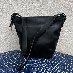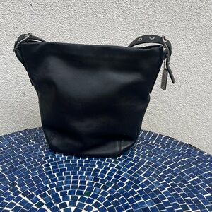 black leather, bucket shape, signature logo, convertible strap, vintage accessory, cowhide texture, silver accents, compact size, mid-century style, minimalist design