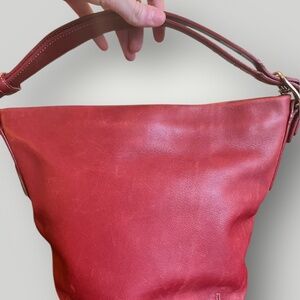Genuine vintage Coach Legacy Soho bucket hobo, style No. L2S-9186. Crafted from buttery red glove-tanned leather with classic Coach stitching and signature hangtag. Spacious interior with zip pocket and fabric “C” lining.