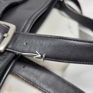 Black leather handbag with double shoulder straps and silver buckle details. It appears to be a tote-style handbag, suitable for casual or business use. The bag has a smooth finish with visible stitching along the edges and a subtle logo tag hanging from one of the straps.