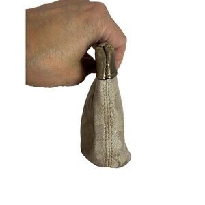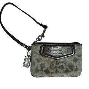 SILVER wristlet with silvery signature C jacquard, silver leather, zip top, hangtag. Approx. 5 3/4"W X 4"H X 3/8"D