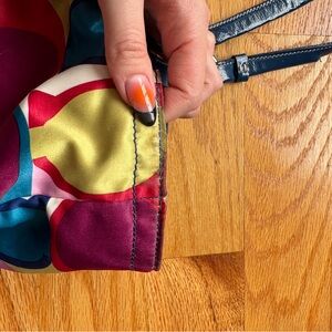 Coach satin tote with multicolor c logo design. See photos for signs of wear - some scuffs/snags throughout and a small crack on the strap.