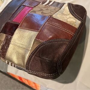 Stylish patchwork leather shoulder bag featuring a mix of brown, gold, and red tones. Perfect for adding a unique touch to any outfit. Used with some wearing. (See photos) Medium size: 9.5”H, 10.25”W, 2”D.