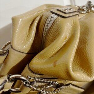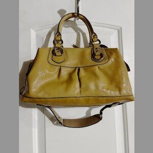 Beautiful Coach patent leather satchel in a stunning yellow/mustard gold color. This structured handbag features glossy patent leather construction with dual rolled handles, a shoulder strap, and signature Coach branding. The bag comes with a decorative brown scarf tied to the handles adding extra style. Quality construction with brass/gold-tone hardware throughout.