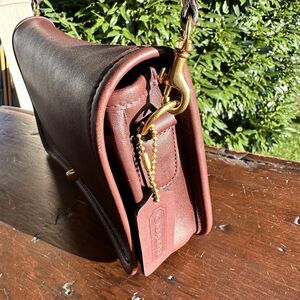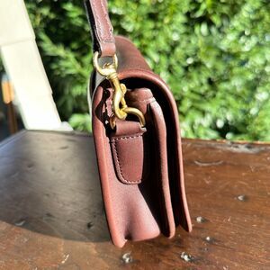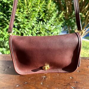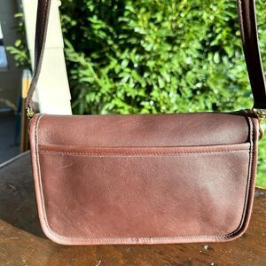 Classic Coach Pocket Purse in smooth, glove-tanned full-grain leather. Beautiful rich mahogany color with a simple flap front and turn-lock closure, back slip pocket, and adjustable crossbody strap. Interior is unlined suede with one main compartment and front slip pocket.