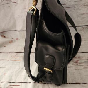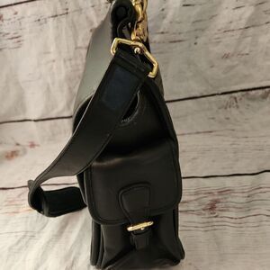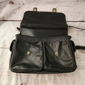 Black leather laptop/Briefcase with gold tone hardware. Exterior phone pocket on each side and 2 front clasp closure pockets. The interior has 1 large zip closure pocket. The interior is in great condition. The exterior is in good used vintage condition. Refer to photos for light wear, tarnishing on hardwear, and small dents.