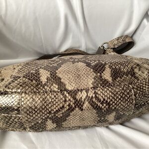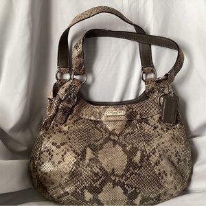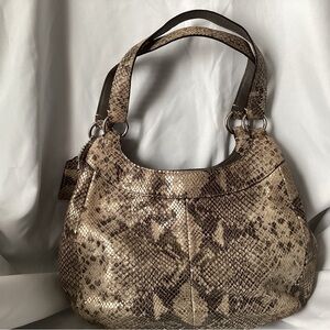 Stylish Coach shoulder bag with a striking python pattern. Features a blend of brown and tan tones. Perfect for adding a touch of luxury to your outfit.
