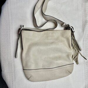 Offered is this large soft leather shoulder bag by Coach in Ivory color with tassel detail, silver tone fittings and zipper top. Has adjustable wide shoulder strap (1 1/4"). Has one exterior zipper pocket, Coach signature fabric lining with divided pocket on one side and zippered pocket on opposite side. Shows a little wear and a couple of tiny scuffs from use or storage but overall would rate Excellent Used Condition. 11 inches by 11 inches.