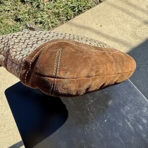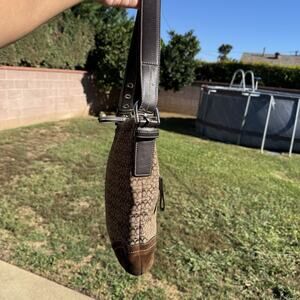 Vintage Y2K Coach Signature Mini C Bag Canvas Suede Shoulder Bag Purse Brown Canvas With Suede Bottom and leather handles with silver metal hardware F10944