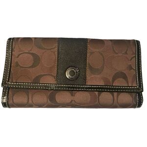 Trifold signature wallet, leather trim, snap closure, jacquard exterior, coin/cash and cc slots and signature logo