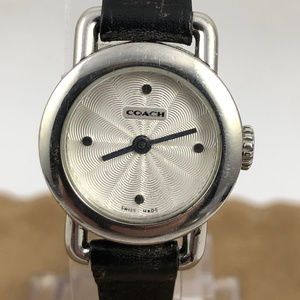 Vintage Coach 3/4 inch Diameter Stainless Steel Swiss Made Ladies Watch 0250- 7.076.890 Pre Owned in good condition has a few scuffs and scratches (see pictures) fits up to size 6 (6.5 inch) black Leather Strap Coach Logo Front and Back new battery serviced