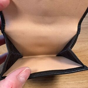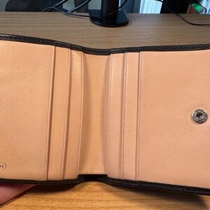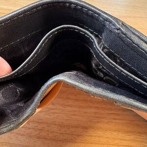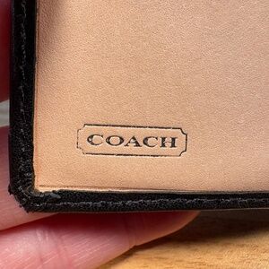 Vintage Coach Small Wallet in black with a silver buckle. It features 2 bill folds, a coin compartment, and space for credit cards. The wallet has a silver buckle, giving it a sleek and metallic appearance. Perfect for stylish and organized women.Leather