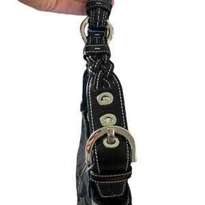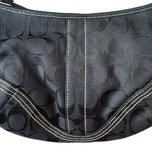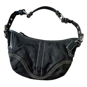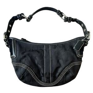 Vintage Coach SoHo Signature Jacquard Logo Monogram Small Shoulder Bag. Black fabric bag with contrasting white stitches. Braided strap with chunky silver hardware.