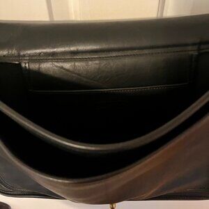 Rich black leather! This classic legal-size briefcase is perfect for business needs and its features are ideal for travel or commuting. It has a roomy interior with a convenient full-length outside back pocket for frequently used files. A gusseted pocket under the flap for bulkier items, and an inside slip pocket holds smaller items. Detachable shoulder strap allows for handheld carry while the brass buckles of the shoulder strap tuck away neatly inside. Original hangtag. This bag is perfect for both men & women.