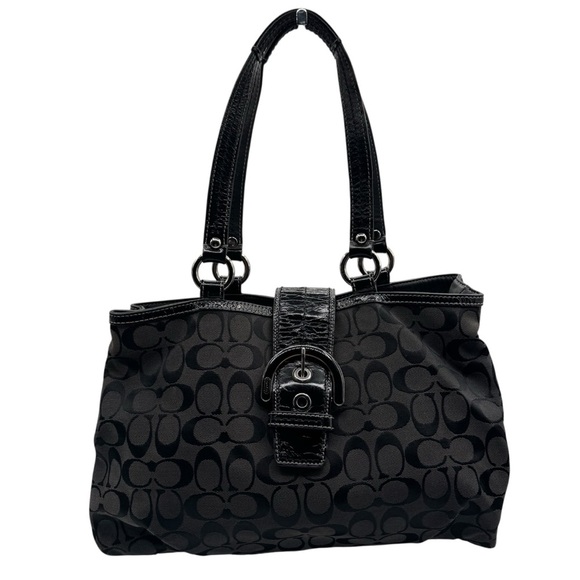 Chic black shoulder bag with iconic Coach pattern. Stylish buckle detail. Ideal for everyday use.