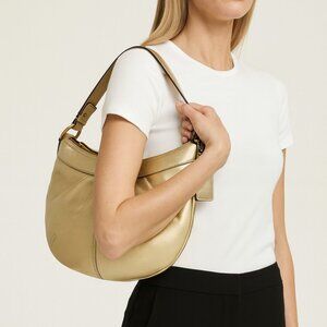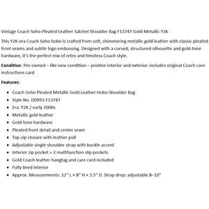 This Y2K-era Coach Soho hobo is crafted from soft, shimmering metallic gold leather with classic pleated front seams and subtle logo embossing. Designed with a curved, structured silhouette and gold-tone hardware, it’s the perfect mix of retro and timeless Coach style.