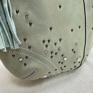 Not structured bag (stuffed in pictures to show shape), studs and rhinestones used as embellishments front and back (none missing), closes with a zipper ending in a suede tassel and the small two sided hang tag. The strap is suede on top and metallic leather underneath, it can be adjusted with the buckles. Inside is lined in light blue sateen with a zippered pocket and two open ones.