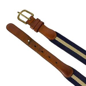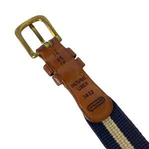 Vintage Coach Tabbed Leather & Natural Linen Striped Belt Brass Buckle Size 34
