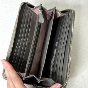 Features: zipper closure, card slots, pockets and zipper pocket inside, silver logo