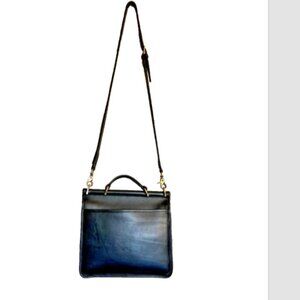 The bag features a black leather exterior and black suede/leather interior. Its solid pattern and classic square shape are accented with a sophisticated turn-lock closure, ensuring that your belongings are secure while on the move.The bag measures 10 inches in width, 10 inches in height, and 2.75 inches in depth, providing ample space for daily essentials. An adjustable 22" leather strap offers personalized comfort, while the gold-tone hardware adds a touch of understated glam.