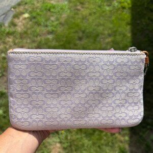 Vintage Coach Wristlet Wallet Lavender Signature Print with Leather, this wristlet is preloved and in good used condition, be sure to view photos as they are part of the condition.
