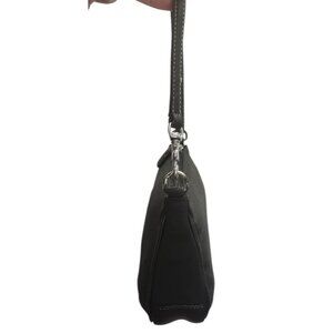 This vintage Coach black mini handbag from the late 1990's is a rare and stylish accessory for women. With a solid black exterior made of nylon and leather, it features a zip closure, black leather handle/strap, and inner pockets for organization. Perfect for parties or cocktail occasions, this clutch also comes with a bag charm and is part of the Coach product line. Made in the United States, this unique piece exudes timeless elegance and sophistication.