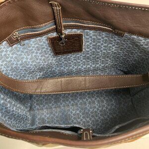 Vintage Coach brown and tan shoulder bag featuring a unique patchwork design with mixed fabrics and textures. Includes signature logo detailing and a beautiful light blue interior — a standout designer piece.