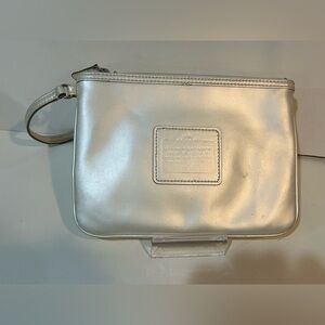 Chic metallic leather wristlet. Stylish and versatile accessory.