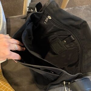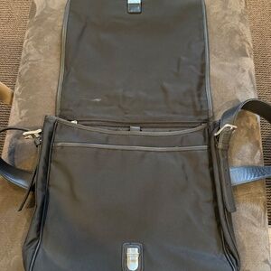 All black nylon-canvas with leather straps and silver buckles. Barely used, no wear and tare. All original buckles/zippers. Looks brand new. Three large compartments with smaller pockets for great organization. Two of the main compartments zipper and the bag closes with a secure buckle.