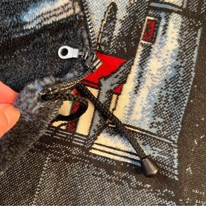 Details: thick material, has pockets, drawstring on the bottom, zip up front, MADE IN USA