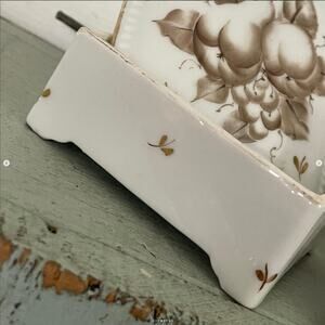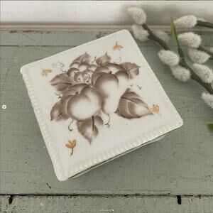 Vintage porcelain / bone china square trinket container box with hand-painted fruit and flower design.