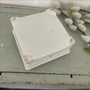 Measures about 3.5 x 3.5 x 1.5 inches with gold accents and raised bead edge.