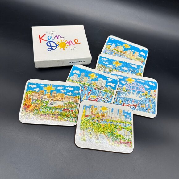 Vintage Coasters Ken Done 1980s Set Of 6 Australia City Cork Back Original Box