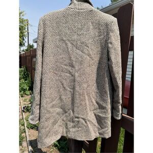 Vintage coat. The brand is P. L. C. Fine outerwear. 100% pure wool. Professionally dry clean low moisture steam press. That is the only tag and that's the only thing it says. This coat has two big pockets on the front. Two big brown buttons. Get ready to step out in style with this vintage 80s trench coat. Made of 100% wool, this pea coat features a multicolor twill fabric that brings a unique and sophisticated look to your wardrobe. It has long sleeves and a button closure that makes it perfect for both casual and workwear occasions. This regular fit coat It's a great addition to any wardrobe, especially if you love vintage clothing. The coat has been well taken care of, and it's dry clean only. You'll love the 80s theme and the fact that it's made in the United States. Pink salmon satin lining. The lining is perfectly clean. Two under arms needs repair. The coat is in amazing condition for age. There's a spot on the back. I have not tried to remove it.