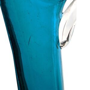 Vintage Blue Art Glass Decanter with 4 Cordial Glasses. Decanter measures 12" in height and does not come with a stopper. Cups measure 4 1/4" in height. Good condition. Pitcher has surface scratches and a chip on the handle.