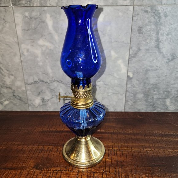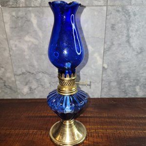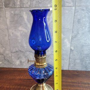 Vintage Cobalt Blue Glass 10" Kerosene/Oil Lamp, Made in Hong Kong