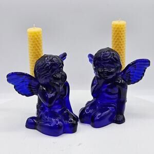 Vintage Cobalt Blue Glass Angel Candlestick Holders Angel on Knees Figurines. Cherish the beauty of timeless glass! No chips or cracks. Yellow candles not included. This stunning pair of cobalt blue glass angel candlestick holders features angels sitting down, adding a celestial touch to any space. Crafted in depression glass style, they make a perfect holiday centerpiece or vintage decor accent. Their rich blue hue and intricate detailing bring a sense of artistry and nostalgia. Whether displayed on a mantel or dining table, these angelic candle holders create a serene and elegant ambiance.