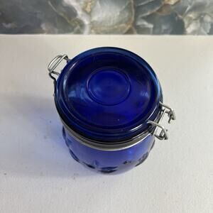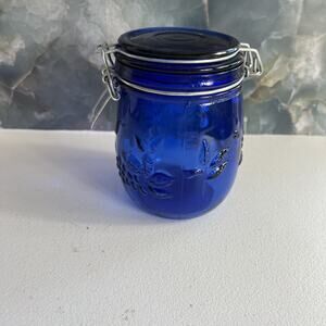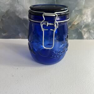 This vintage cobalt blue glass canister jar with an embossed fruit design and wire latch is a charming addition to any kitchen or home decor. The medium-sized round canister features a single compartment, a matching lid, and is made of glass and metal wire materials. With a retro style and vintage appeal, this original piece adds a touch of cottage charm and nostalgia to your space. Perfect for storing small kitchen items or as a decorative accent, this unique canister is sure to be a conversation starter in your home.