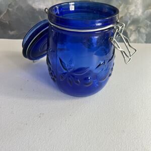 Vintage Cobalt Blue Glass Canister Jar & Lid Embossed Fruit Design & Wire Latch