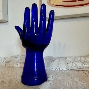 Add a touch of elegance to your collection or display with this Vintage Cobalt Blue Glass Hand Ring Display. Perfect for showcasing jewelry or as a striking decorative piece, this unique item combines practicality with vintage charm.