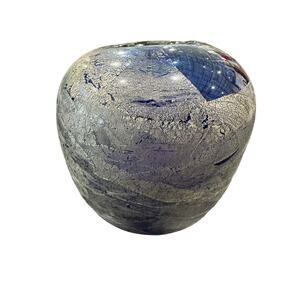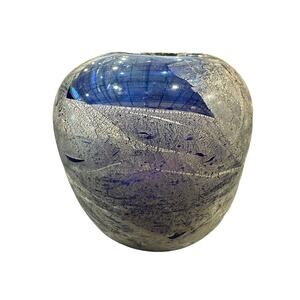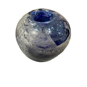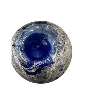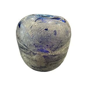 This beautiful vintage vase is a stunning piece of Murano art glass. The cobalt blue and silver aventurine glass is hand blown with intricate details, creating a unique and timeless piece. The vase stands at 5 inches tall and measures 6.25 inches in width, making it the perfect size for any room.