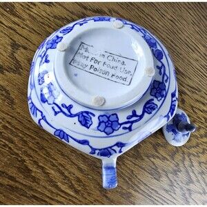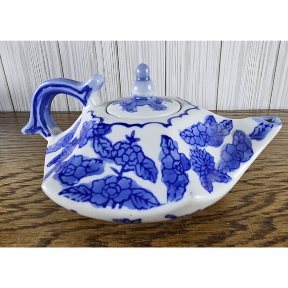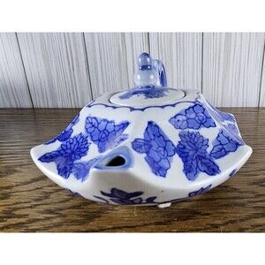 The cobalt blue floral pattern on a white background is in good condition with no chips or cracks. The teapot is made in China for the Bombay Co. probably in the 1980s. Although it appears to be a teapot, the item is is decorative, and not intended for food or beverages. The teapot is blue and white porcelain, with an Asian inspired floral design. Please review the photos. The teapot measures 6"x4"x2-5"